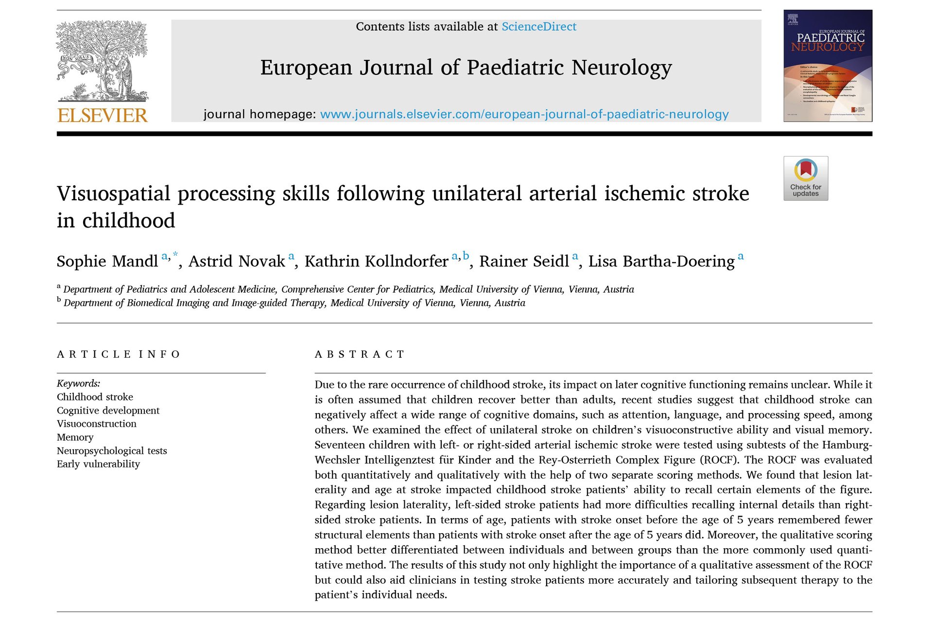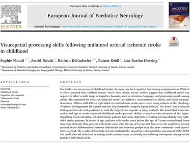 The first paper within the BUILD CARE project entitled "Visuospatial processing skills following unilateral arterial ischemic stroke in childhood" by the authors Sophie Mandl, Astrid Novak, Kathrin Kollndorfer, Rainer Seidl, Lisa Bartha-Doering was published in the European Journal of Pediatric Neurology.