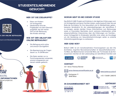 The survey is aimed at parents of children with stroke. Ideally, the questionnaire should be completed by the parent who spends most time caring for the child. The survey is available in German and Dutch.